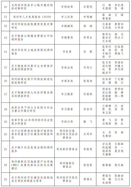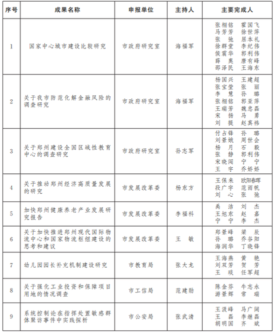 ![]() 来源:大河报·大河财立方 原标题:《名单来了!郑州2018年35篇政府决策研究优秀成果出炉》 大河财立方消息 1月9日,为发扬成绩,鼓励先进,郑州市人民政府对 《国家中心城市建设比较研究》等35篇决策研究优秀成果予以通报表彰。其中,市政府研究室和市发展改革委各收获3篇。 据了解,2018年,郑州市各级、各部门和广大决策研究工作者,按照《郑州市人民政府办公厅关于下达2018年政府系统重点研究课题计划的通知》要求,紧密结合郑州市经济社会发展中遇到的阶段性矛盾、困难和问题,突出郑州国家中心城市建设、全面深化改革、三大攻坚任务、社会民生相关问题,对郑州市经济社会发展中的重大问题和人民群众普遍关注的热点、难点问题进行了深入细致的调查研究,形成了一批高水平的研究成果,为各级、各部门科学决策和及时有效地推动工作提供了重要借鉴,取得了显著成绩。 附:2018年郑州市政府决策研究优秀成果名单 ![]() ![]() ![]() |
