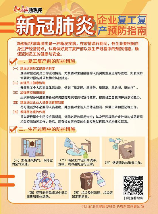 ![]() 在河北省卫生健康委员会的指导下,长城新媒体集团倾力打造《权威科普》栏目,以融媒产品形式,生动、及时、准确地发布权威防疫知识,指导公众科学防疫,战胜疫情。第八期新冠肺炎企业复工复产预防指南,请接收。 一、随着疫情逐渐稳定,各地的企业逐步开始了复工复产。为了减少疫情风险,企业在复工复产前需要提前做好预防措施。 (1)员工返岗前要掌握其流动情况,提前排查可能存在的感染风险。发现异常要及时报告并釆取防控措施。 (2)对员工个人和家属要实施健康监测,发现异常要及时采取措施。 ![]() 做好疫情防控知识宣传教育。 (3)提高员工的自我防护意识和能力,做好新冠肺炎防控知识培训和宣传教育。 (4)减少不必要的人员进出企业,对来访人员要加强体温检测和登记,佩戴口罩才可进入。 (5)防疫物资要准备充足,发挥好企业医务室的作用。 二、在生产过程中,人员接触增多,做好预防很重要。 (1)加强通风换气,保持室内空气流通。如果使用空调,要保证空调系统供风安全畅通,不使用空调时应当关闭回风通道。 ![]() 七步洗手法。 (2)员工在工作场所要勤洗手,确保洗手、喷淋等设施运行正常。 (3)做好工作场所物体表面以及工作服、座椅套等纺织物的清洁消毒工作,加强职工宿舍、食堂以及卫生间的清洁与通风。 (4)减少开会次数,推荐开视频会议,推荐错峰就餐,减少员工聚集和集体活动。 (5)加强垃圾分类管理,及时收集并清运,加强对垃圾盛装容器的清洁和消毒。 ![]() 当员工出现可疑症状时,要马上做好三件事。 三、当员工出现发热、乏力、干咳等可疑症状时,要马上做好三件事。 (1)立即对其进行暂时隔离处置。 (2)及时安排就医。 (3)在专业人员指导下对其接触过的区域和物品进行消毒处理。 (资料来源:国家卫生健康委员会) ![]() 新冠肺炎企业复工复产预防指南1。 ![]() 新冠肺炎企业复工复产预防指南2。 ![]() 新冠肺炎企业复工复产预防指南3。 |