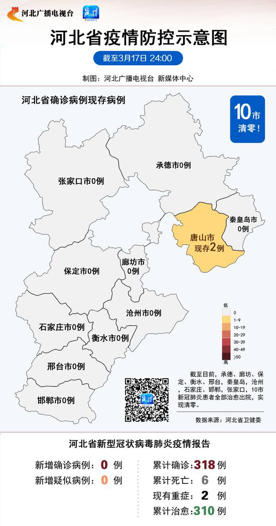 ![]() 2020年3月17日0—24时,河北省报告无新型冠状病毒肺炎新增确诊病例,无新增死亡病例,无新增疑似病例。 当日新增治愈出院病例0例,解除隔离医学观察的密切接触者0人。 截至3月17日24时,河北省现有确诊病例2例(均为重症病例),累计治愈出院病例310例,累计死亡病例6例,累计报告确诊病例318例,现有疑似病例0例。累计追踪到密切接触者10933人,尚在隔离医学观察的密切接触者0人。 确诊病例中,唐山市58例、沧州市48例、张家口市41例、保定市32例、邯郸市32例、廊坊市30例、石家庄市29例、邢台市23例、秦皇岛市10例、衡水市8例、承德市7例;死亡病例中,沧州市3例、秦皇岛市1例、唐山市1例、邢台市1例;重症病例中,唐山市2例;出院病例中,唐山市55例、沧州市45例、张家口市41例、保定市32例、邯郸市32例、廊坊市30例、石家庄市29例、邢台市22例、秦皇岛市9例、衡水市8例、承德市7例。 河北省卫生健康委员会 2020年3月18日 |