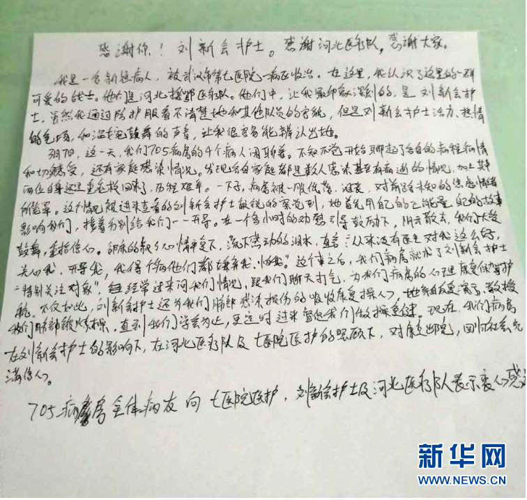 “在这里,我认识和接触到了一群可爱的战士,他们来自河北支援湖北医疗队。虽然通过防护服看不清楚她和其他队员的容貌,但是刘新会护士满是活力热情的声音,让我很容易能辨认出她。” ![]() 这是武汉市第七医院705病室的全体新冠肺炎患者写给河北省支援湖北医疗队队员、石家庄市第三医院护士刘新会的一封信。A4大小的纸页上写满了字迹,简单质朴的语言却流露出真挚的情感,字里行间都记录着患者与医务人员之间的情谊。 ![]() 患者把信交给刘新会时说:“其实这些话我们早已经想好,当时我们没有纸,只能存在手机上,现在我们在纸上郑重抄写了下来亲手交给你,真心感谢你和河北医疗队的队员。谢谢你,可爱的‘战士’!” ![]() +1 [作者: 高丽 责任编辑: 杨丹宇 ] 相关新闻 |