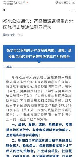 中新网衡水3月18日电 (记者 崔志平)17日,河北省衡水市公安局发出《关于严厉惩处瞒报、漏报、谎报重点地区旅行史等违法犯罪行为的通告》。通告称,疫情防控期间,瞒报、漏报、谎报重点地区旅行史等违法犯罪行为情节严重的,依据《刑法》第114条、第115条第一款或第330条之规定,按照以危险方法危害公共安全罪或妨害传染病防治罪立案侦查,依法追究刑事责任。 ![]() 衡水市公安局官方公众号网络截图。 为有效应对人员流动日益频繁和入境回衡人员增多造成的不确定因素和潜在风险,慎终如始做好新冠肺炎疫情防控工作,根据《中华人民共和国刑法》、《中华人民共和国治安管理处罚法》、《中华人民共和国传染病防治法》等法律法规及相关司法解释,以及衡水市新冠肺炎疫情防控工作指挥部3月16日发布的《关于进一步强化疫情防控措施的通告》,在衡水市疫情防控期间,有下列行为之一的,依法予以严厉惩处: 缓报、漏报、谎报、隐瞒病史、疫情重点地区旅行史、与患者或疑似患者接触史,逃避隔离和医学观察的;明知自己可能或者应当属于新冠肺炎疑似病人、确诊病人、病原携带者或者上述三种人的密切接触者,不主动向单位、社区报告,不服从单位、社区健康监测管理,不到定点医疗机构就诊的;故意谎报、隐瞒行动轨迹和接触人员,引起传染病传播或者有传播严重风险的;明知自己被感染,属于病毒携带者,仍然在外流动、出入公共场所、与他人接触,存在潜在的疫情传染风险,对疫情防控工作带来严重危害的。 通告称,凡有以上行为的,公安机关将依据《中华人民共和国治安管理处罚法》第50条之规定,给予治安处罚。情节严重的,依据《刑法》第114条、第115条第一款或第330条之规定,按照以危险方法危害公共安全罪或妨害传染病防治罪立案侦查,依法追究刑事责任。欢迎广大人民群众积极举报上述违法犯罪线索。举报电话:110。本通告自发布之日起实施。(完) |