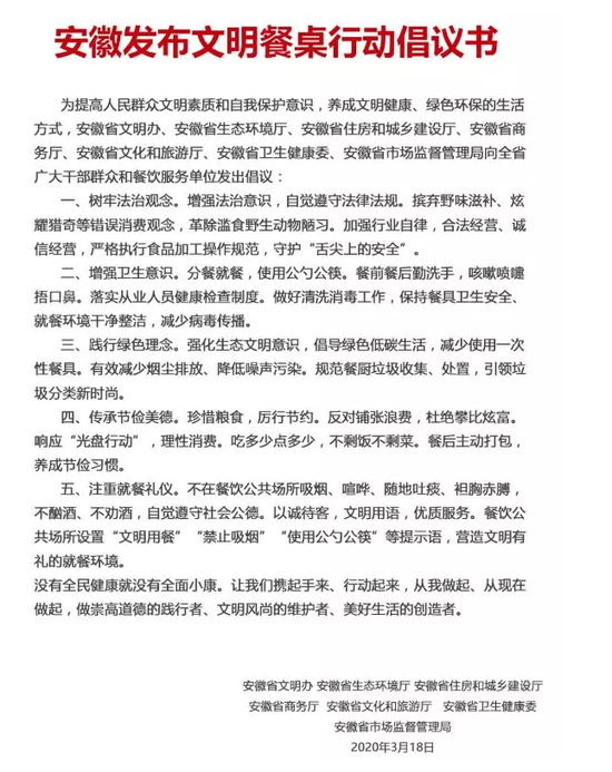 3月18日,安徽省文明办、省生态环境厅等七部门联合发布《文明餐桌行动倡议书》,倡议全省广大干部群众和餐饮服务单位摈弃野味滋补、炫耀猎奇等错误消费观念,革除滥食野生动物陋习;分餐就餐,使用公勺公筷;餐前餐后勤洗手,咳嗽喷嚏捂口鼻;减少使用一次性餐具;规范餐厨垃圾收集、处置,引领垃圾分类新时尚。