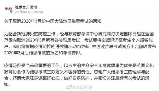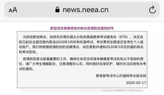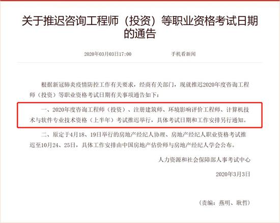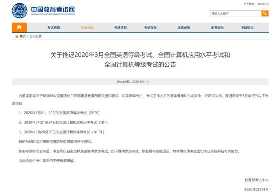 来源:中华全国学联、广商青年说、河北共青团 财政部、人力资源和社会保障部最新消息!2020年度全国会计专业技术初级资格考试推迟举行!具体考试日期和工作安排另行通知! ![]() 除此之外,我们还为大家汇总了其他考试的相关信息,由于消息随时都有可能更新,现在的汇总仅供大家参考! 01 职业证书类 ?中小学教师资格考试推迟举行 教育部发布通知称,根据党中央、国务院关于新型冠状病毒感染的肺炎疫情防控工作有关精神和教育部相关通知要求,在疫情流行期间不举办大型聚集性活动和考试,原定于3月中旬进行的中小学教师资格考试和教师资格认定工作推迟举行,具体考试时间和认定报名时间将根据疫情防控进展情况另行通知。 ![]() ?ACCA(国际注册会计师)3月考试延期 ?CMA考试变更至5月10号进行 原定于2020年4月11日的举行的CMA中文考试延期至2020年5月10日(星期日)举行。 ![]() ?CIA/CCSA考试推迟至5月7日-5月16日 原定于3月1日-3月10日的2020年第一次CIA/CCSA考试推迟至5月7日-5月16日 ![]() ?3月基金从业考试推迟举行 ![]() ?原定于3月14日的期货从业考试推迟举行 ![]() 02 最近推迟的考试信息 ?中国人事考试网发布通告 咨询工程师(投资)、注册建筑师、环境影响评价工程师、计算机技术与软件专业技术资格(上半年)考试推迟举行,具体考试日期和工作安排另行通知。 ![]() ![]() ?二建考试时间确定推迟 截至目前,山东、湖北、河南、安徽等多个原定于在5.30-31日举行二建考试的省份纷纷发布通知推迟二建考试时间,仅有个别省市还未发布相关通知。 03 招生类 ![]() ?全国高等教育自学考试推迟 根据党中央、国务院关于新型冠状病毒感染的肺炎疫情防控工作有关指示精神和教育部相关通知要求,现结合疫情实际,经研究,原定于2020年4月11日至12日举行的全国高等教育自学考试推迟举行,具体考试时间将根据疫情防控进展情况另行通知。 ?高校特殊类型招生考试、高职单招推迟 1月24日,教育部下发《教育部部署教育系统新型冠状病毒感染的肺炎疫情防控应急预案工作》,明确指出近期各地各高校将举行的特殊类型招生考试、高职分类招生考试等应推迟进行。 ![]() ?上海春季招生考试延期 上海市教育考试院发布通知称,根据教育部、上海市委市政府和两委关于切实做好当前新型冠状病毒感染的肺炎疫情防控工作要求,为最大程度保护本市广大考生权益,维护社会正常秩序,按市教委工作部署,2020年春季考试招生的总体框架保持不变,但原定于2月15日开始的2020年春季考试招生网上咨询延期至3月初开展,后续相关工作相应延期;原定到高校开展的自主校测和专业信息登记等工作方式进行调整。 ![]() 04 部分地方考试 ?2020江苏省考面试推迟 为贯彻落实中央和省委、省政府关于新型冠状病毒感染的肺炎疫情防控工作的有关要求,经研究,江苏省2020年考试录用公务员面试时间推迟,具体安排另行通知,请广大考生耐心等待。 ![]() ?浙江省推迟2020年度省考笔试时间 1月29日,浙江人事考试网发布公告,推迟原定于2020年2月22日-23日举行的浙江省各级机关单位考试录用公务员(含四级联考、紧缺职位、特警等)、省级机关单位面向基层公开遴选优秀公务员的笔试工作,打印准考证等环节的时间相应推迟,重启时间将根据疫情稳控情况另行安排。请广大考生密切关注“浙江组织工作网”、“浙江省公务员考试录用系统”发布的相关通知,了解最新考试安排。 ?上海市推迟2020年度报名及面试时间 上海市公务员局发布了《关于推迟上海市2020年度考试录用公务员职位报名及面试时间的公告》,宣布为贯彻落实国家和市委、市政府关于新型冠状病毒感染的肺炎预防控制工作的有关要求,本市2020年度考试录用公务员职位报名及面试时间推迟,具体安排将另行通知。 ![]() 05 语言类 ?托福取消3月考试安排 教育部考试中心及托福官方纷纷发布通知,取消中国大陆三月份所有托福考试。 ![]() ?雅思取消3月全国范围考试 在托福取消之前,雅思也在2月14日宣布:经与教育部考试中心研究商讨决定自即日起在全国范围内取消2020年3月所有各类雅思考试,考试费将全额退还至考生个人报名账户。 将根据疫情防控的进展情况动态更新, 并通过雅思考试官方平台随时发布2020年3月后雅思考试的报名和考试安排。 ![]() ?DELF-DALF法语考试 鉴于疫情及中国政府针对人员流动的建议,法国高等教育署六个中心(北京、上海、成都、广州、武汉和沈阳)原定于2020年1月29日至2月17日(含)所有的评估面试将延期举办。所涉及报考人员无需支付额外费用。2月份和3月份的法语考试将延期举办。 ![]() ?2020年3月21、22日的全国英语等级考试(PETS) ![]() ?英语专业八级考试 原定于2020年4月18日举行的英语专业四级考试的考试时间将进行适当调整,具体考试时间另行通知。 ![]() 06 计算机类 ?全国计算机应用水平考试(NIT) ?全国计算机等级考试(NCRE) ![]() 说明:因考试政策、内容不断变化与调整,以上信息仅供参考,如有异议,请考生以权威部门最新公布的内容为准! |
