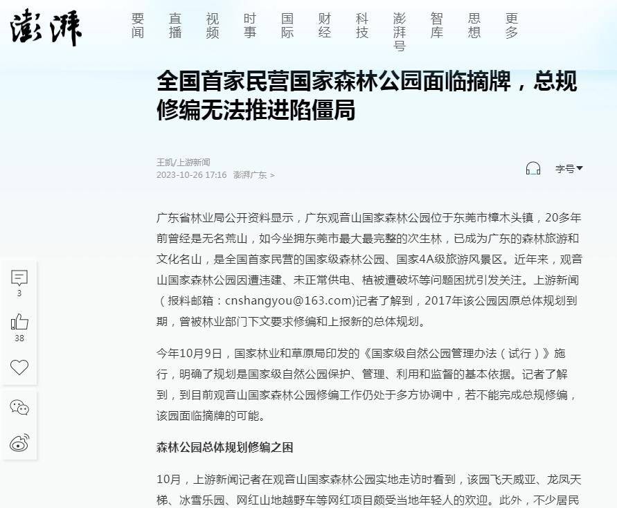 独立撰稿人 李海波 《深圳特区报》报道 《深圳特区报》报道结尾:在未来5至10年内,东莞观音山力争将公园建设成为达到国家5A级旅游标准的景区,依托森林资源,积极探索森林养生、森林体验、森林康养等健康旅游新模式,加快发展多元化、多层次的森林旅游新业态,助推新旧动能转换,守住绿水青山,打造生态名山。 上游新闻/澎湃新闻:观音山国家森林公园面临摘牌 上面这二篇文章有意思吧?!为了东莞的经济发展,民营企业在努力打造5A景区奋斗;而政府部门在设置障碍遏制其发展,更是欲将其打落凡尘而泯灭! 广东观音山国家森林公园是全国首家民营企业管理经营的国家级森林公园,由广东文化名商黄淦波于1999年与樟木头镇石新村委签订承包期50年、投资超十亿元率领300多观音山人将一座荒山打造成的是国家4A级旅游风景区,被国家林业与草原局称为“全国生态样本公园”。 自2005年12月23日批准成立观音山国家森林公园至今,观音山公司管理林地面积9857.7亩。按照《中央财政林业补助资金管理办法》规定的标准计算,观音山公司应得补贴款项500余万元。可是,该林地24年的政策性补贴款项,观音山公司及黄淦波作为实际管理人不仅未得到分文,反而还受到东莞市林业局等部门长期的各种打压。 国家级森林公园是我国自然保护地的一种重要类型,是林业现代化建设的重要内容,在生态文明和美丽中国建设中具有重要地位。加强国家级森林公园管理是各级林业主管部门的重要职责,是国家级森林公园事业健康持续发展的根本保障。国家级森林公园建设在有效保护森林风景资源、弘扬传播生态文化、满足公众美好生活需求、助力精准扶贫等方面发挥着重要作用,取得了显著成绩。与此同时,由于认识不足、监管不力、管理松散等原因,一些国家级森林公园重开发轻保护,甚至违规开发的现象依然存在。2018年1月12日, 国家林业局发布《国家林业局关于进一步加强国家级森林公园管理的通知》,一是要求各地林业局切实提高对国家级森林公园管理工作重要性的认识,各级林业主管部门要深刻汲取祁连山生态破坏事件的教训,牢固树立“绿水青山就是金山银山”和以人民为中心的发展理念,坚持保护优先、合理利用的原则,加强组织领导,强化管理监督,履行责任担当,切实把国家级森林公园管理好、保护好、建设好,以更优质的自然资源和更美好的生态环境服务社会,造福一方,惠及群众。二是全面提升国家级森林公园管理能力,准确把握国家级森林公园功能定位:国家级森林公园属国家禁止开发区域,是禁止进行工业化城镇化开发的重点生态功能区。国家级森林公园的主体功能是保护国家重要森林风景资源和生物多样性、传播森林生态文化、开展森林生态旅游;强化国家级森林公园总体规划权威性;严控建设项目使用国家级森林公园林地;严禁不符合国家级森林公园主体功能的开发活动和行为;多措并举实现国家级森林公园管理规范化。三是有效解决国家级森林公园管理中的主要问题:明晰国家级森林公园范围和界限,省级林业主管部门要统一组织,对本地区国家级森林公园的范围和界限进行逐一调查核实,确保每个国家级森林公园的范围和界限能准确落实到图纸、落实到全国林地“一张图”上;明确国家级森林公园林地保护等级,县级以上林业主管部门应当按照《全国林地保护利用规划纲要(2010—2020年)》的要求,将国家级森林公园内的林地划定为Ⅱ级及以上保护林地,切实加强国家级森林公园森林资源管理和保护;妥善处理国家级森林公园内采矿、采石等历史遗留问题。 该通知印发之日起3个月内,各省级林业主管部门要对本地区国家级森林公园开展全面排查,将无机构、无人员、无规划、无建设的“四无”森林公园以及存在重大违法违规建设的森林公园名单报送我局。我局将下发限期整改通知,对整改达不到要求的将按程序撤销该国家级森林公园,并对违法违规事件依法进行处理。局驻各地森林资源监督专员办事处对本监督区国家级森林公园建设管理中存在的突出问题及整改落实情况实施监督。 林业局是森林公园的保护神,从中央媒体到地方媒体却不断曝出观音山公园被东莞市林业局多方打压的现象 但观音山公园遇到的违法违规事件却并没有得到处理,因为东莞市林业局没有上报观音山公园内相关违建及被毁林等违法行为。 东莞市林业局连续四任局长无视观音山国家森林公园被摧残 其实,对于观音山国家森林公园内的违规建设及毁林行为,观音山公园除了向东莞市委市政府和各级林业部门举报外,包括中央电视台、新快报等中央及地方媒体均有不断曝光,而作为主管部门的东莞市林业局从罗松茂担任局长开始连续二十年四任局长均不予理睬,以软暴力对应。何谓软暴力?就是对观音山合法诉求不支持、不配合、不作为,反而使用手中的权力摧残观音山公园。 2012年中央电视台以《国家4A级森林公园竟藏22栋私人别墅》为题报道 众多文章反映了东莞市林业局放任不法分子在森林公园大量建豪华坟墓、香港人在公园内修建别墅、不法分子毁林种植荔枝林等毁林2000亩案件视而不见,东莞市林业局长期坚决否认观音山有毁林现象。同时还曝光了林业局在原市委书记刘志庚(落马贪官,被判刑)和是市政法委书记张志雄授意下联合东莞市各相关局对公园进行长