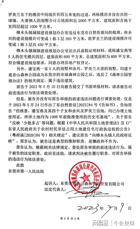 东莞市第一法院法官朱珍珍、王海建、易菲菲枉法裁判被实名举报 独立撰稿人 李海波 近日,广东观音山国家森林公园对东莞市第一法院法官朱珍珍、王海建、易菲菲故意违背事实和法律作枉法裁判违纪违法行为向各级法院和人大进行了实名举报。 实名举报信。送达单位为:东莞市第一人民法院及林辉芳院长和纪检监察组、东莞市中级人民法院及陈小辉院长和纪检监察组、广东省高级人民法院及张海波院长和纪检监察组、最高人民法院及张军院长和纪检监察组;东莞市人大常委会、广东省人大常委会。 监督申请书 同日,观音山还向东莞市检察院提起了监督申请书,请求对第一法院提出检察建议,对法官朱珍珍、王建海、易菲菲依法处分。 举报信认为:东莞市第一人民法院法官朱珍珍、王建海、易菲菲,在办理我单位东莞市观音山森林公园开发有限公司诉东莞市自然资源局行政不作为一案中,公然官官相护,故意违背事实和法律作出枉法裁判,实为少见。从该案办理情况看,他们已经丧失公正之心,不能秉公办案,依法应受处分,且不宜继续任职法官。因此,举报人实名举报,恳请上述单位监督和责令法院对他们依法处分并提请同级人大常委会免除他们的法官职务。 香港人竟在国家森林公园内建豪华别墅 还有农村宅基地证 在举报人经营管理的4A级景区广东观音山国家森林公园里面,有香港人余兴、罗美兰夫妻和香港人潘宝燕及其四个子女名下的两处豪华私家别墅,每处占地三四亩、建筑面积二三千平,竟然还都办有农村宅基地证。 举报人调查发现,该两处别墅用地,是潘宝燕和余兴分别于1997年和2005年花了几十万港币从所有权人樟木头镇石新村(现改为社区)和他人手中非法购买取得,然后,通过隐瞒非法买卖农村集体土地的事实,编造相关材料,违法办了农村宅基地证和规划许可证,其中潘宝燕及其四个子女一家5口办理了5本宅基地证,余兴、罗美兰夫妻办理了2本宅基地证。虽然当年的法律规定,回家乡定居的香港居民可以申请农村宅基地,但是,余兴、罗美兰夫妻与潘宝燕及其四个子女,都是香港居民,石新村也不是他们的家乡。所以,他们不可能依法取得农村宅基地,并且国家禁止农村集体土地非法买卖,对农村宅基地实行“一户一宅”。据此,举报人认为东莞市自然资源局给他们办理宅基地证、樟木头镇城镇建设规划办公室给他们办理规划许可证,肯定是违法的。 举报人调查还发现,该两处别墅用地原是林地,办理宅基地证和规划许可证,没有依法取得林业部门的同意,也没有依法办理农用地转用审批手续。 该两处别墅还存在用地少批多占、建筑面积少批多建的违法问题。 其中潘宝燕及其四个子女等5人被批准的住宅用地面积合计是600平、建筑占地面积合计是600平,而实际上他们住宅用地面积近2000平、建筑占地面积上千平;规划许可的建设规模是一幢四层、建筑面积800平方米,而实际建设规模是共6层、建筑面积3000多平。余兴名下被批准的住宅宗地面积为140平、建筑占地面积为42.8平、建筑总面积为128.5平,南面与罗美兰共墙。罗美兰名下的住宅用地被批准的住宅宗地面积为140平、建筑占地面积为103.9平、建筑总面积为311.8平。而实际上,余兴名下的楼房建筑占地面积多达100多平、建筑总面积有400多平;余兴名下的楼房和罗美兰名下的楼房中间有四五米宽的过道,两栋楼房并没有共用一堵墙:夫妻俩人的别墅合计占地面积近2000平、建筑面积含地下室四层超过了2000平。 樟木头镇城镇建设规划办公室违反宅基地证上的批准,2005年将余兴的建设规模许可变成1栋3层393平,将罗美兰的建设规模许可变成1栋3层共450平。樟木头镇城镇建设规划办公室不仅对潘宝燕及其四个子女在1998年没有取得规划许可的情况下违法建房的行为不予查处,反而在2002年为其补办了规划许可证,并将规划许可证的办理日期违法提前到1998年违法建房时的日期,以掩盖潘宝燕及其四个子女没有取得规划许可就建房的违法事实。并且,樟木头镇城镇建设规划办公室还出具虚假证明材料,谎称潘宝燕等5人的住宅楼共四层、建基面积600平、总建筑面积为800平,符合镇建设规划要求,同意办理房地产权登记。 起诉至东莞市第一法院,法官故意违背事实驳回起诉 举报人调查了解到的樟木头镇违法为香港人办理产权证的情况,在2023年5月10日向东莞市自然资源局提交了书面举报材料。但是,东莞市自然资源局却于2023年5月24日书面告知举报人,根据《中华人民共和国土地管理法》第七十八条及《广东省人民政府关于农村村民非法占用土地建住宅行政执法权的公告》(粤府函[2020]84号)相关规定”,建议“向樟木头镇人民政府反映”。 《中华人民共和国土地管理法》第七十八条及《广东省人民政府关于农村村民非法占用土地建住宅行政执法权的公告》明确规定的违法主体是农村村民,而没有包括非农村村民。举报人认为,东莞市自然资源局明知余兴、罗美兰夫妻和潘宝燕及其四个子女都是香港人,不具有石新村村民的身份,却错误适用《中华人民共和国土地管理法》第七十八条及《广东省人民政府关于农村村民非法占用土地建住宅行政执法权的公告》,认定举报人所投诉事项的执法权限不属于其权限范围而让去樟木头镇政府反映,这是典型的推卸职责,是懒政和不作为。于是,举报人提起行政诉讼,要求判决