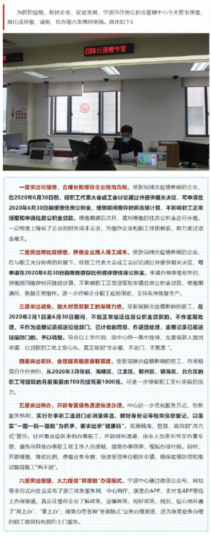为防控疫情、帮扶企业、促进发展,宁波市住房公积金管理中心今天推出缓缴、降比或停缴、减免、特办等六条惠民举措。